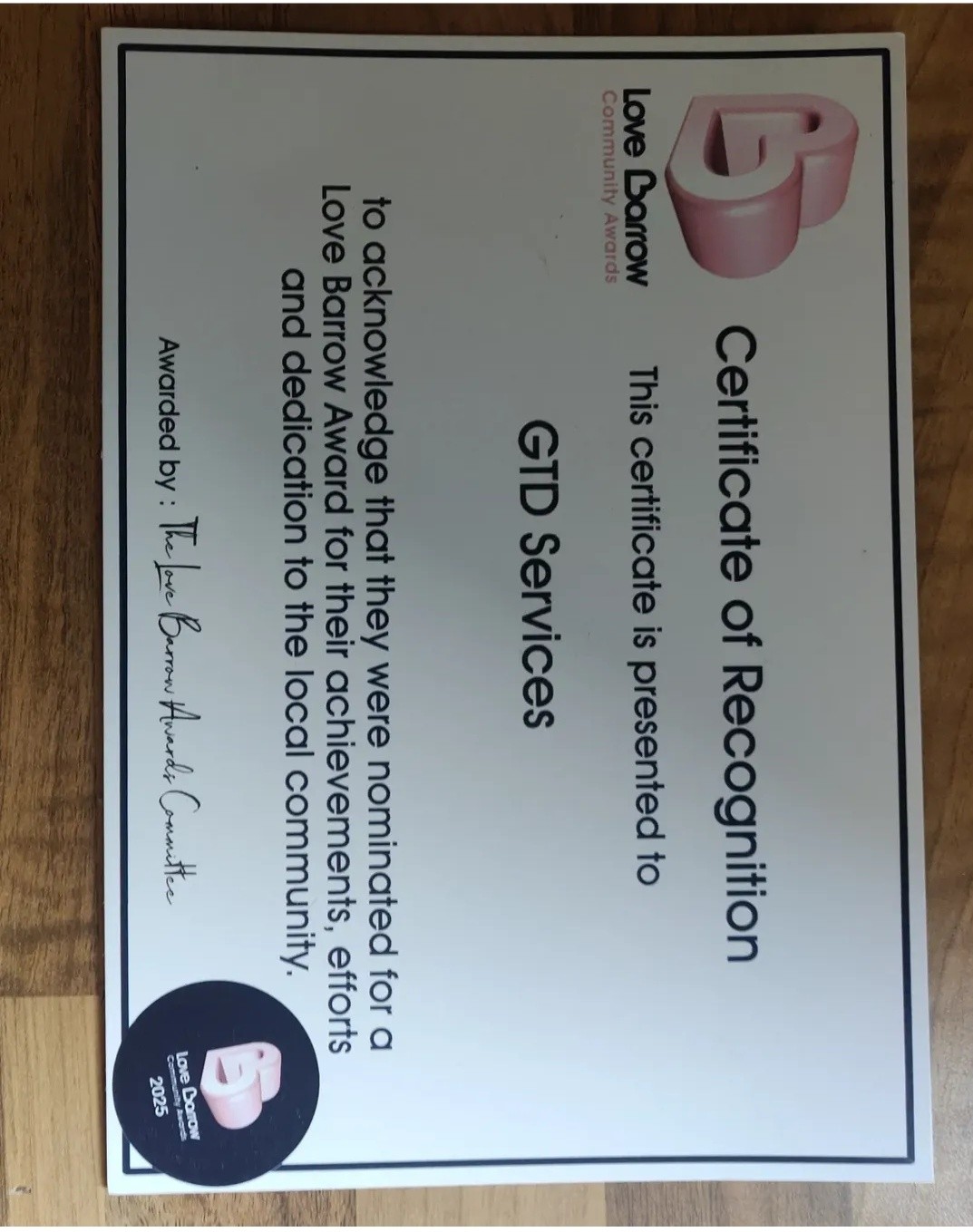 "We have used GTD Services before and they did a fantastic job on our extension roof. This time we had the gutters cleared & cleaned- a job well done. Friendly gentleman and did a fantastic professional job, really pleased, would definitely recommend".